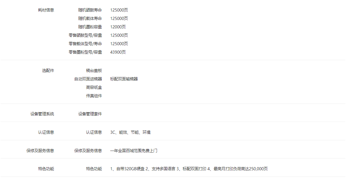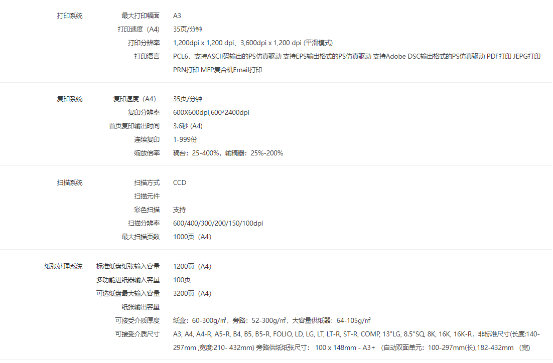 紙盒容量  :   標(biāo)準(zhǔn)紙盤紙張輸入容量 1200頁(A4)